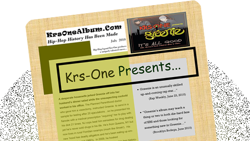 "It's ALL Good" is one of the hottest online pre-selling hip-hop albums EVER! KRS-ONE, has brought together more than a half dozen other hip-hop legends including DJ Kenny Parker, Jesse West, P. Diddy's Hitmen (Sean C & LV), Busy Bee, and more! The album debuts a powerful, unique emcee from whom consciousness pours: Greenie.
