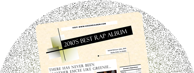 The Planned Parenthood doctor who gave him a vasectomy ordered him to send a sample for testing after 20 ejaculations...so he told his girlfriend he has a medical prescription for her to get out 21 loads...New Jersey cops beat him up for drug dealing yet he's never sold drugs in his life. He can take out almost any emcee in a battle. He's from Queens, New York but he lives in a rural Floridian swamp area now (much like Shrek!)...Greenie's been dirt poor. He's been filthy rich. He was happily married. He was tragically divorced. He was raised by a drug-addicted older sister with a penchant for suicide yet now he raises his own children completely sober... In 2010, Krs-One, the "teacha" took Greenie on as the most unique...and gifted apprentice EVER...